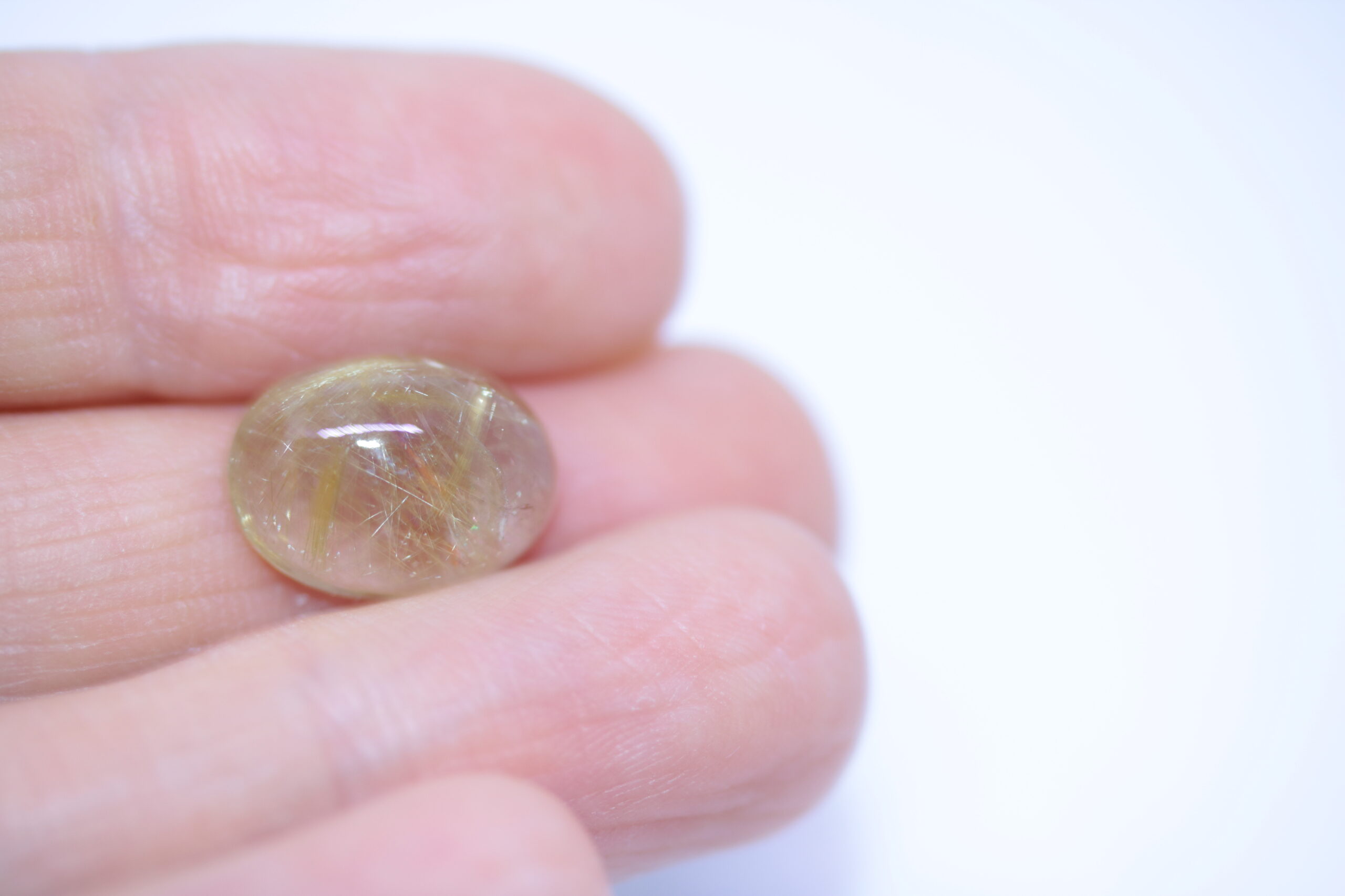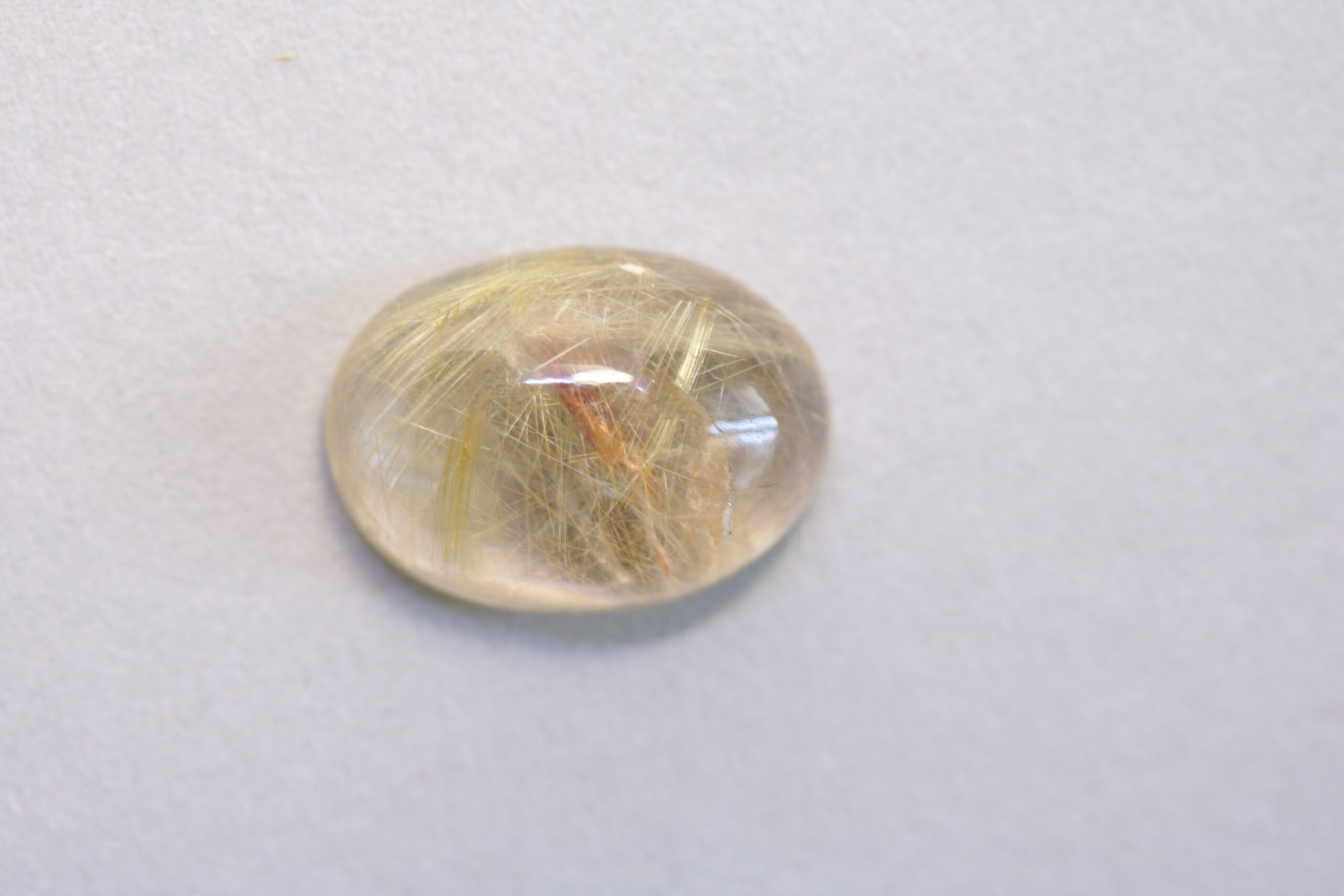 6,21 карата кварц златен рутилов; форма на шлифовка – овал кабушон; Размер 14,36 х 10,14 х 5,85 мм; Цвят – златен рутилов; Чистота – прозрачен; Произход-Индия
