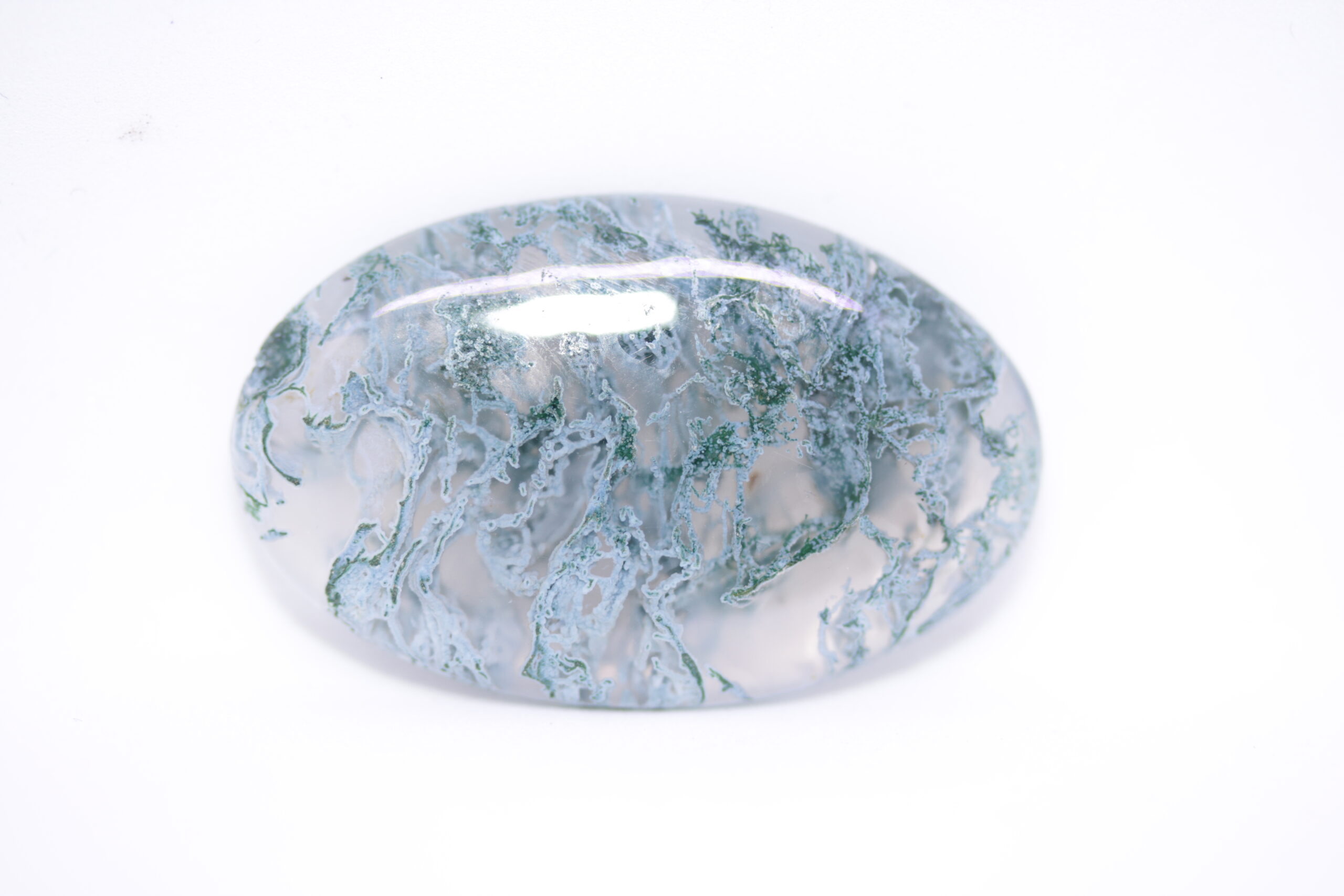 26,85 карата ахат мъхов естествен; форма на шлифоване – овал кабушон; размери – 35,4 x 22,4 х 4,3 mm, нетретиран; Чистота-полупрозрачен, Произход-Индонезия