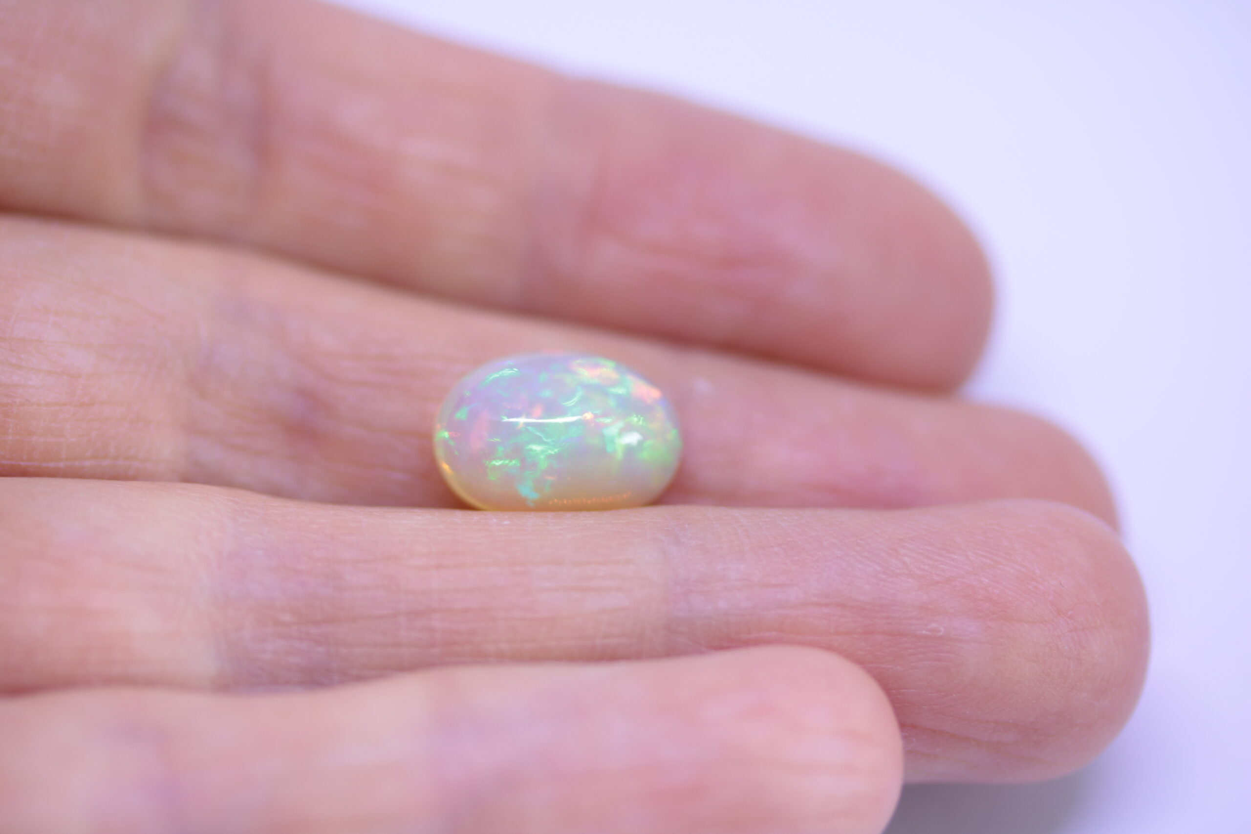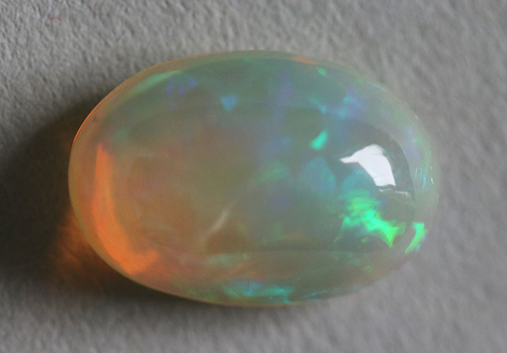 0,52 карата млечен опал от Етиопия; форма – овал кабушон; размери- 7,23 x 5,25 х 2,72mm, Естествен нетретиран, Прозрачност-полупрозрачен, 1 брой опал многоцветен жълтеникав цвят