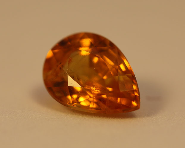 1,0 карат оранжев сапфир естествен; форма на шлифоване – круша; размери – 6,9 x 5 х 3,14 мм