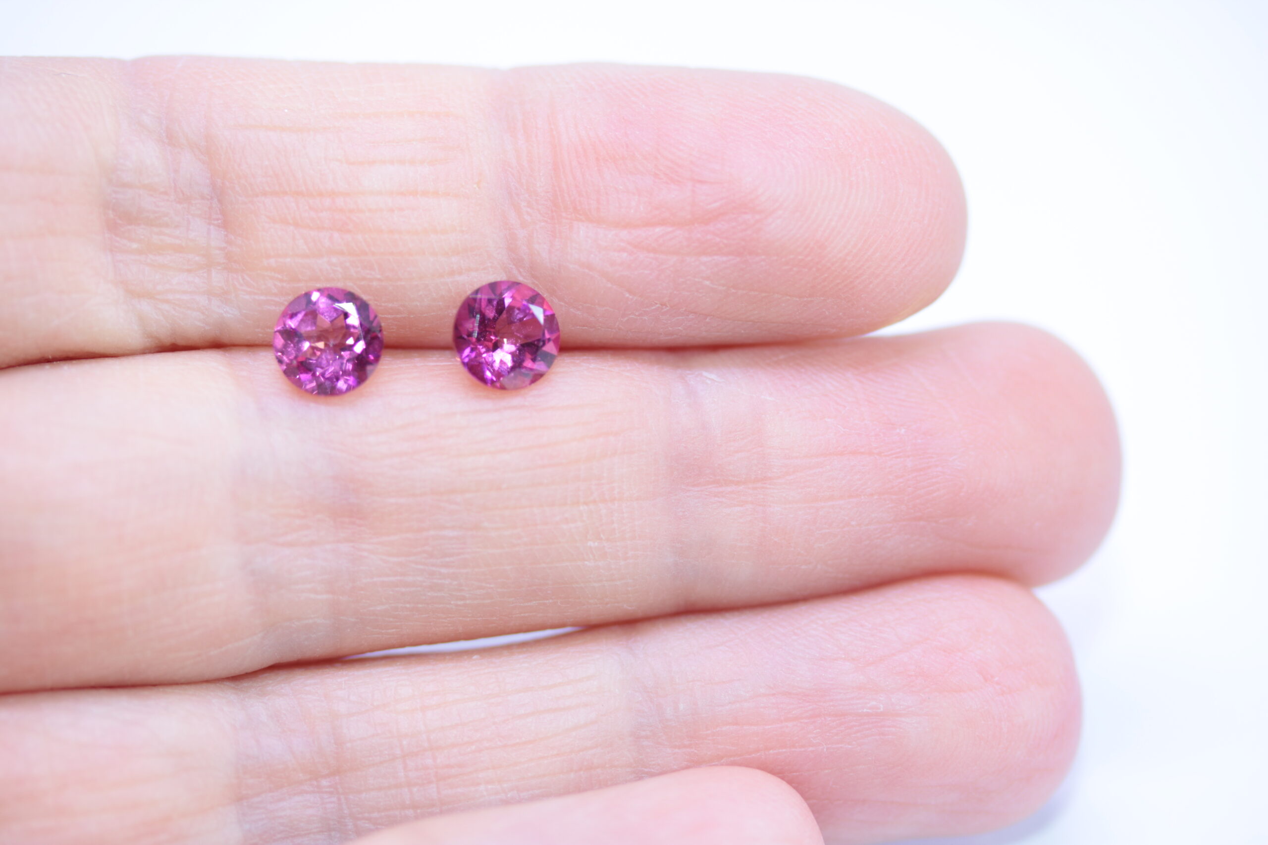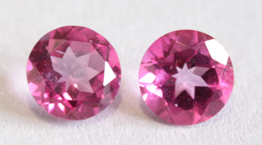 2 броя топаз розов мистик; форма на шлифовка – кръгла брилянтна; Тегло – 1,92 карата общо / средно 0,96 карата всеки един; Размер средно 6,5 х 3,67 мм всеки един; Цвят – розов мистик; Прозрачност – прозрачни; Произход-Бразилия
