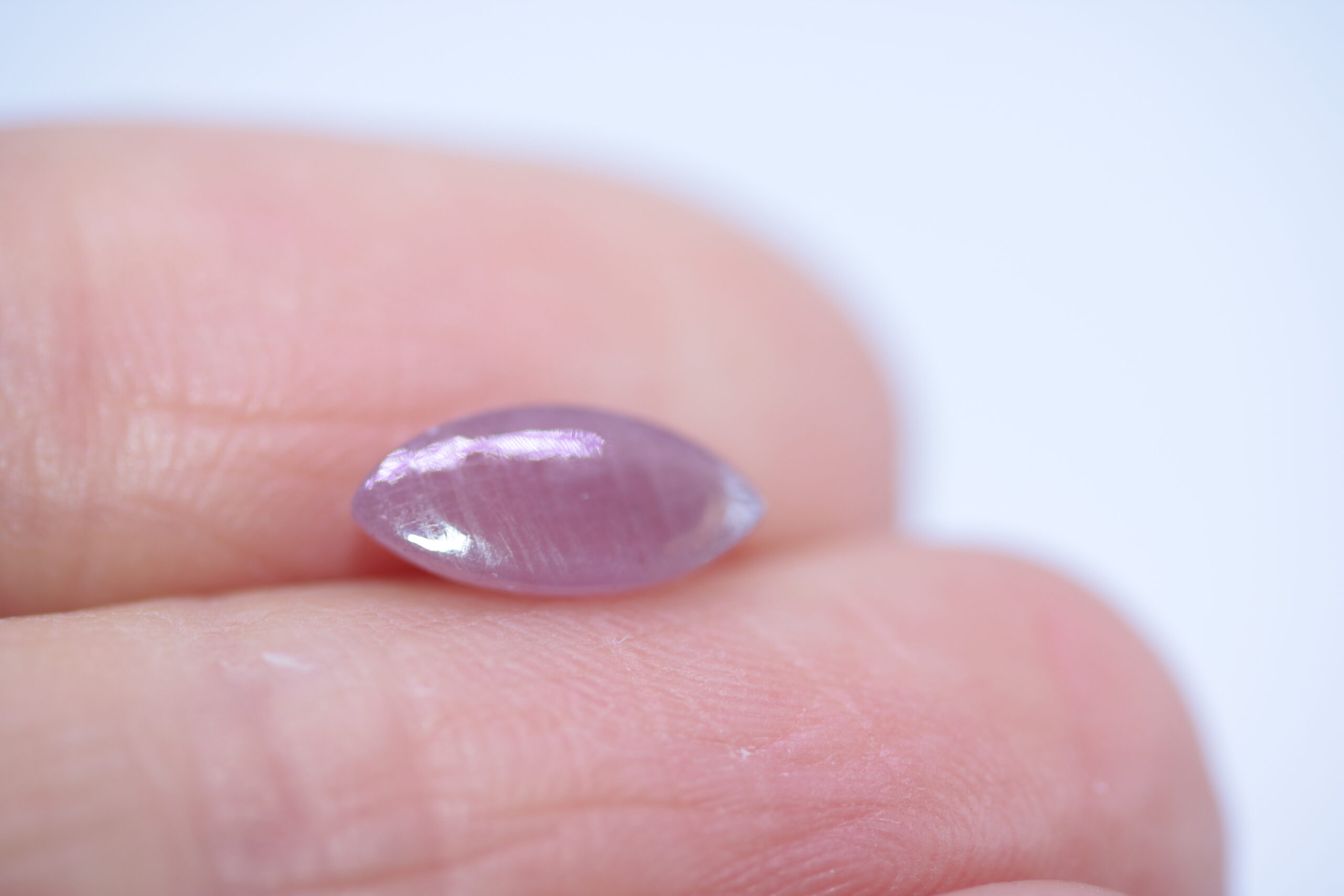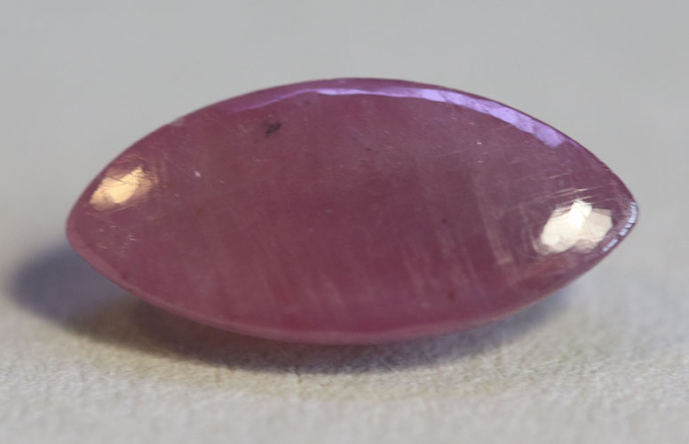 1,58 карата червен рубин кабошон с форма подобна на маркиз; Размер 10,2 х 5 x 3,3 мм, Чистота – непрозрачен