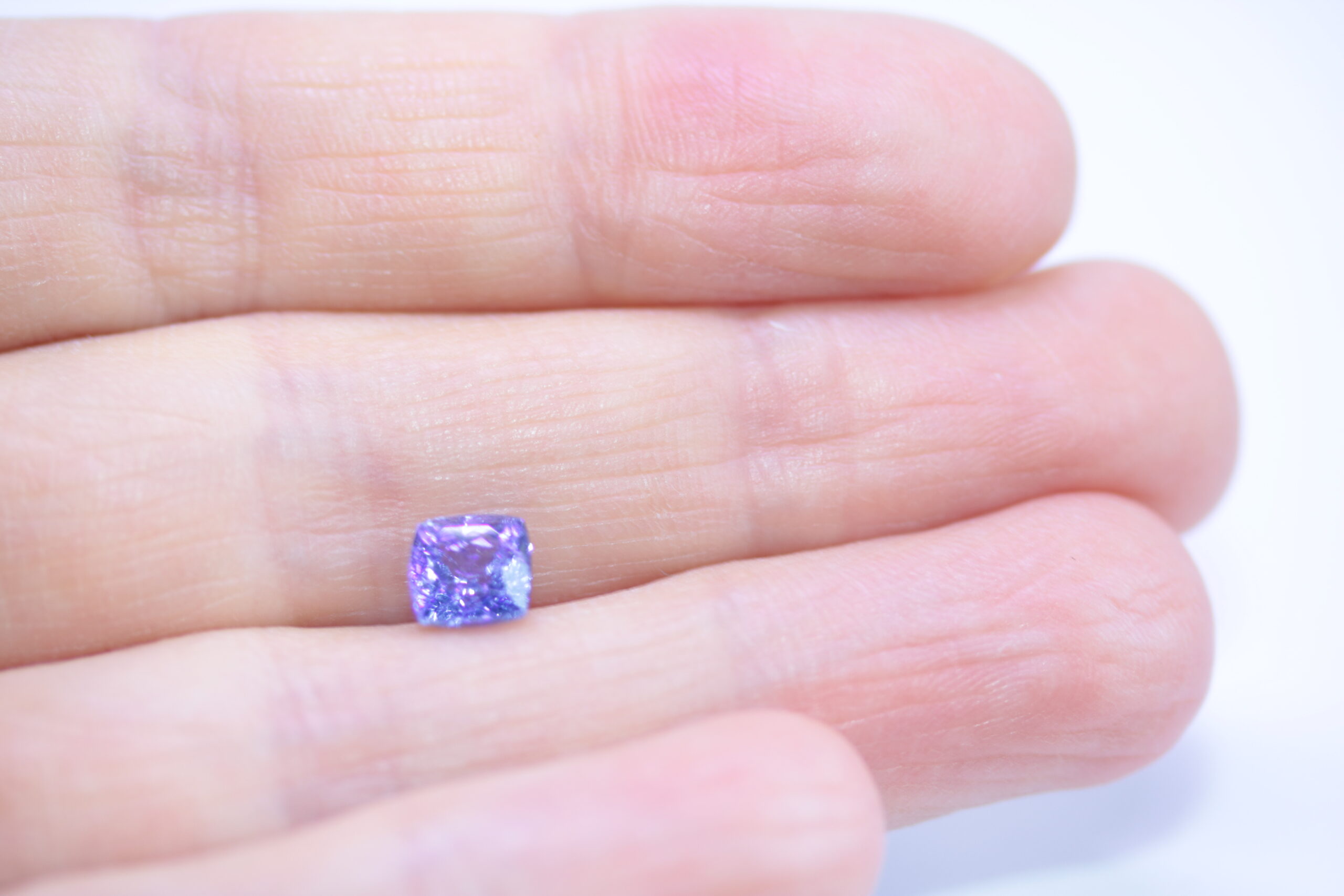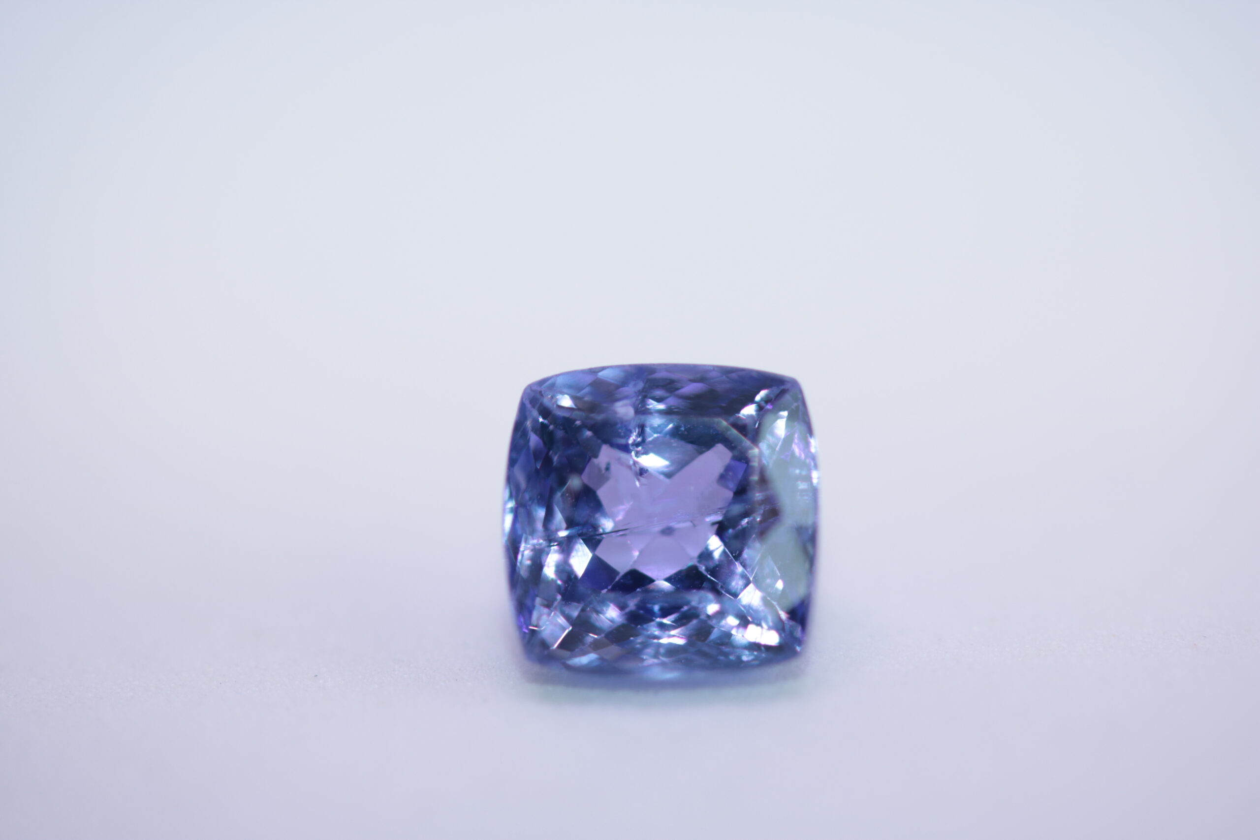1,36 карата син танзанит естествен от Танзания; форма на шлифоване – кушон; размери – 6,49 x 6,2 х 4,79 mm, Третиране – обичайно топлинно нагряване, Чистота-прозрачен